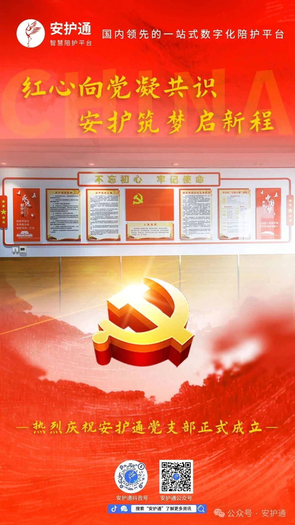 新起点,新征程,新担当!安护通党支部的成立,开启了党建与企业发展同频共振、互促共进的新篇章。我们将以此次成立为契机,团结带领全体员工听党话、跟党走,凝心聚力、砥砺前行,为守护群众健康、推动陪护行业发展贡献更大的力量!